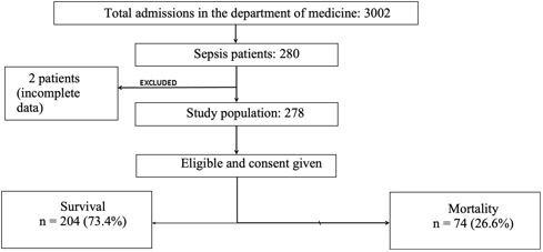 Of the 3002 patients admitted to the Department of Medicine at JDWNRH, there were 278 patients with sepsis. Amongst them, 74 (26.6%) died during hospitalization (Figure 1). As shown in Table 1, more than half (52.1%, 145) were female; and most of the patients with sepsis were aged over 60 years (38.5%).