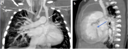 Fig. 1 A 10-month-male infant with Tetralogy of Fallot. a) CT Pulmonary angiography and Coronal Maximum Intensity Projection (MIP) image shows a persistent left superior vena cava (white arrow). b) Coronal MIP image shows a ventricular septal defect (blue arrow).