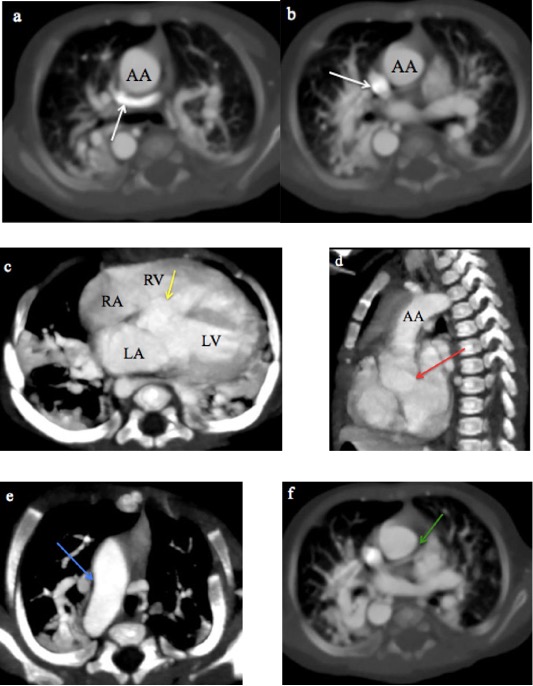 Fig. 3 A 2-month-old male infant with tetralogy of Fallot and a retroaortic left innominate vein. (a, b) CTPA axial MIP images show the retroaortic left innominate vein (white arrow). c) Axial MIP image shows a ventricular septal defect (yellow arrow). d) Sagittal MIP image shows overriding of the aorta (red arrow). e) Axial MIP image shows a right-sided aortic arch (white arrow). f) Axial MIP image shows narrowing of the main pulmonary artery (green arrow), and its right and left branches.