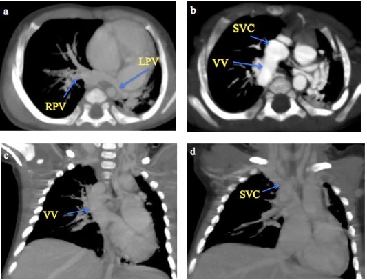 Fig. 4 A 2-month male infant with supracardiac total anomalous pulmonary venous connection. (a-b) CT Pulmonary angiography axial MIP sequential images from caudal to cranial levels showing the left pulmonary veins (LPV) and right pulmonary veins (RPV) converging to form a vertical vein (VV) that drains into the superior vena cava (SVC). (c-d) Coronal MIP images demonstrating the VV draining into the SVC.