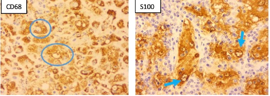 Fig 2. Microscopic images (immuno-stained slides) of an excised right submandibular lymph node from a 58-year-old man at JDWNRH, showing positive staining for CD68 (blue circle) in the lesional histiocytes and emperipolesis highlighted by positive staining for S100 (blue arrow).