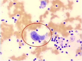 Cytology slides retrieved retrospectively from the regional referral hospital revealed moderately cellular smears composed of histiocytes, lymphocytes and plasma cells in a red blood cell rich background. The histiocytes were large with abundant cytoplasm exhibiting emperipolesis of lymphocytes (Figure 3A-B). A few atypical binucleated histiocytes were also noted (Figure 4).