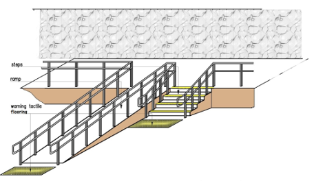 Figure 2 A: Ramp for wheelchair; B: walking aid for the visually impaired on a walkway