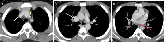 Fig. 2 A 14-year-old boy with a right superior vena cava draining into the left atrium. (a-c) Sequential axial MIP images from cranial to caudal levels show the right SVC (white arrow) draining into the left atrium (red arrow). Left brachiocephalic vein is also seen (yellow arrow).