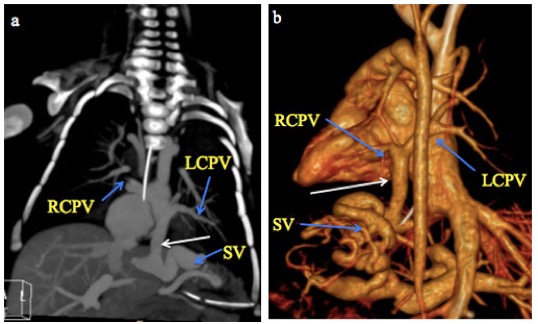 Fig. 5 A month old male infant with infracardiac total anomalous pulmonary venous connection. a) CT Pulmonary angiography coronal MIP and b) 3-D volume-rendered CT images show the right and left superior and inferior pulmonary veins (RCPV and LCPV) joining to form a vertical vein (white arrow) that descends through the diaphragm and drains into a dilated and tortuous splenic vein (SV).