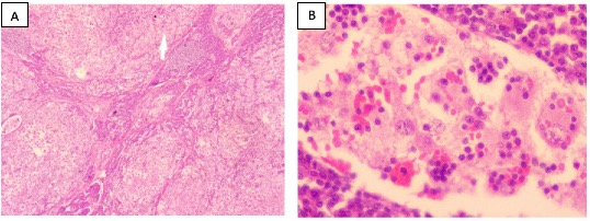 Fig 1. Microscopic images (hematoxylin and eosin, H&E-stained slides) of an excised right submandibular lymph node from a 58-year-old man at JDWNRH. (A). A low-power image showing distended sinuses containing a prominent population of histiocytes (40x). (B). High-power image showing emperipolesis (400x).