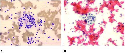 Fig 3. Microscopic images (A. Leishman Giemsa cocktail- and B. Papanicolaou- stained slides) of fine needle aspiration cytology of right submandibular lymph node of a 58-year-old man, showing emperipolesis (400x).
